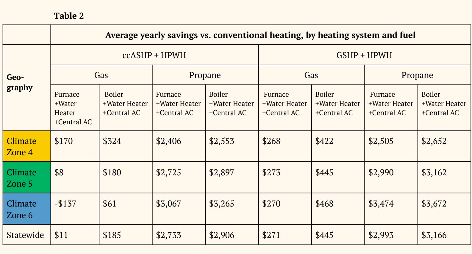 When the main alternative is propane, on the other hand, the figures are astonishingly high. Here in colder Climate Zone 6, where I live, choosing air source heat pumps over a propane furnace yields an estimated $3,067 in savings a year. Zone 6 is the only part of the state where a natural gas furnace wins by a nose as the cheapest option in new construction — but much of Zone 6 is rural, and most rural households have no access to natural gas service, relying heavily on costly trucked-in fuels and firewood.